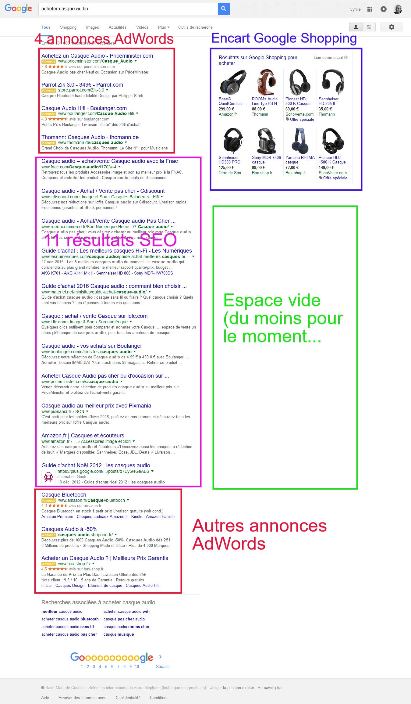 Pour autant, la nouvelle présentation telle que nous la voyons aujourd’hui n’est probablement pas une version définitive, car il parait pour le moins étrange que Google laisse un espace vide aussi béant sur la partie de droite alors qu’il pourrait le monétiser… à moins que cela fasse partie de sa stratégie pour faire grimper rapidement le cours des enchères ?